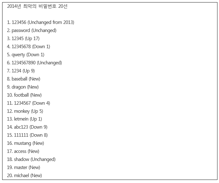 설마 아직도 이런 비밀번호를 사용하는 사람이 있을까 싶지만 놀랍게도 매우 많은 모양이다. 2014년 가장 많이 유출된 비밀번호 1위는 ‘123456’이었다. ‘Password’(2위), ‘12345’(3위), ‘12345678’(4위)이 차례로 뒤를 이었다. 이후의 순위도 비슷한 패턴의 비밀번호였다. 이것들보다 한 단계 나아간 것으로는 보이나 ‘Password1’, ‘Hello123’ 등도 최악의 비밀번호로 꼽힌다. 키보드에서 왼쪽 위에 자리한 문자열을 차례로 누르는 ‘qwerty’ 또한 매우 취약한 비밀번호다. 이 비밀번호를 쓰고 있다면 개인정보가 유출됐을 때 비밀번호가 뚫릴 확률은 100%다. 그것도 즉시 말이다. 이처럼 다른 사람이 유추하기 쉬운 비밀번호를 사용하는 것은 보안상 매우 위험하다.