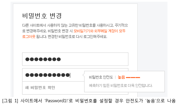 사이트에서는 비밀번호를 설정할 때 자신이 만든 비밀번호가 안전한지 여부를 표시해 알려주는 서비스가 있다. 하지만 사이트에서 안전하다고 분류하는 비밀번호 중에도 실제로는 안전하지 않은 경우가 있다. 대표적인 예가 ‘Password1!’이다. ‘Password1!’는 대/소문자, 숫자, 특수문자를 모두 사용하고 있음에도 보안에 취약하다. 사이트의 비밀번호 안전성 판단 기능은 사용자가 대/소문자, 숫자, 특수문자를 모두 사용하는 경우 공격자가 해킹을 할 때 시도해야 하는 문자의 조합이 늘어나기 때문에 비밀번호가 안전하다고 인식한다. 하지만 ‘Password1!’는 공격자가 아주 쉽게 생각할 수 있는 비밀번호다. 대/소문자, 숫자, 특수문자를 조합했다고 결코 안전한 비밀번호는 아니라는 말이다.